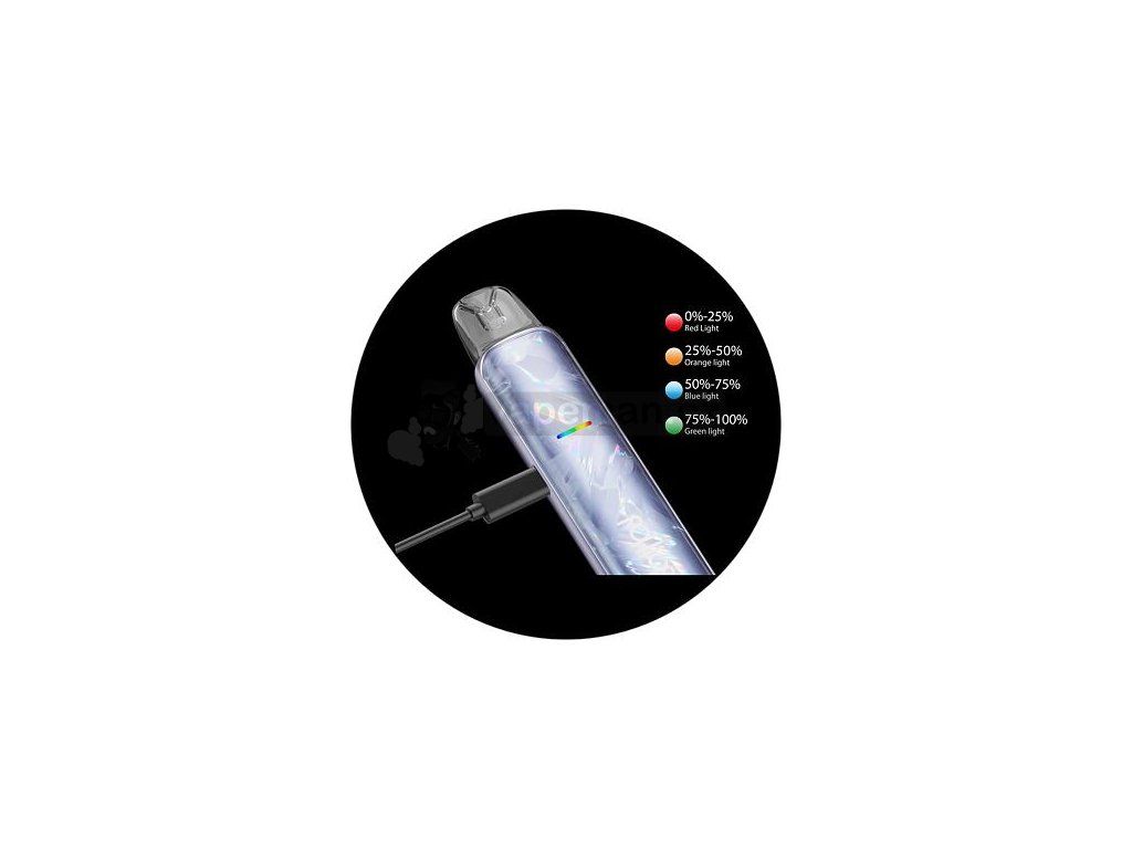 Na těle podu se nachází LED indikátor, který pomocí barevné škály od zelené po červenou intuitivně informuje uživatele o zbývající kapacitě baterie. Kromě stavu nabití rovněž barevnými signály indikuje, zda se baterie stále nabíjí nebo je již plně nabitá. Během procesu nabíjení můžete dokonce i vapovat.