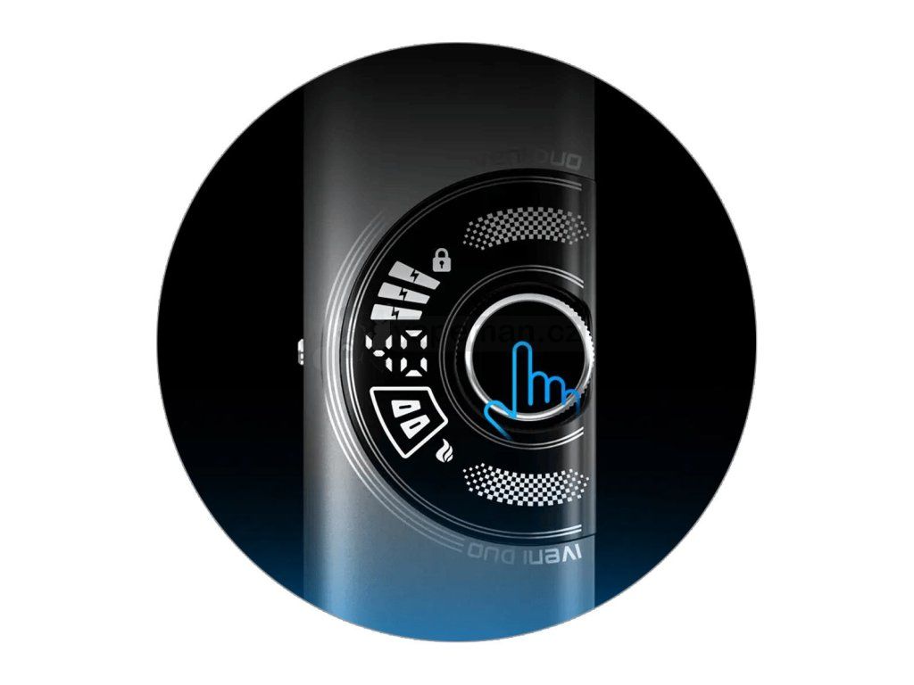 Celkové ovládání modelu iVeni Duo probíhá prostřednictvím jediného otočného tlačítka/kolečka. Různými kombinacemi stisků tak můžete e-cigaretu zapínat a vypínat, uzamykat tlačítko nebo regulovat výkon. Po vyvolání regulace výkonu pak stačí tlačítkem pootočit a výkon si upravit v povoleném rozsahu. Ovládání je snadné, rychlé a intuitivní.