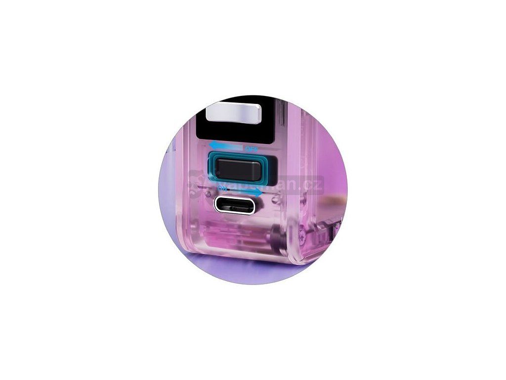 Boční panel modu ukrývá slot pro vložení dvou externích baterií typu 18650. Díky pohonu na dvě baterie si dokáže mod poradit s ohromujícím výkonem a zároveň dodat vždy skvělé a co nejoptimálnější výsledky při vapování. Samozřejmostí je také praktická podpora nabíjení baterií přímo v modu. Tělo modu je vybaveno portem USB-C a mod podporuje nabíjení 2A.