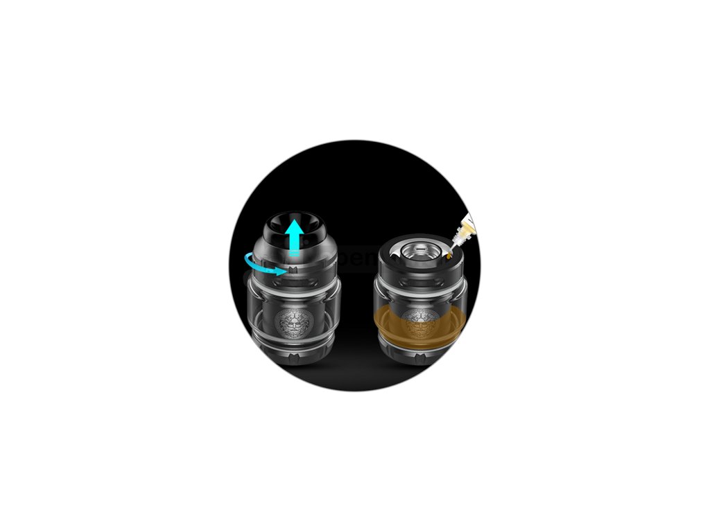 | Vrchní plnění Ve vrchní části se nachází moderní a praktický systém doplňování tanku. Vrchní uzávěr lze odejmout jednoduchým pootočením, jedná se o rychlý bajonetový systém. Následně vrchní část odložíte a začnete plnit. Celý proces zabere jen pár vteřin a následně se můžete začít opět věnovat vapování. |