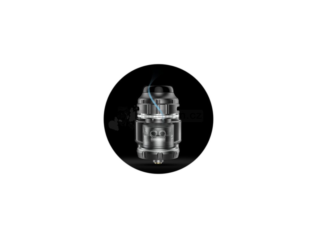Clearomizér GeekVape Zeus X RTA láká rovněž také na obrovský objem tanku. Uprostřed se nachází praktické vyboulené pyrexové tělo, díky němuž můžete do tanku dolít až 4,5 ml e-liquidu. Tuto kapacitu oceníte při cestování, nebo venkovní procházce, kdy není čas na doplňování. Hravě si poradí s intenzivním vapováním. V případě nutnosti doplnění jednoduchým pohybem odejmete vrchní náustek a doplníte potřebné množství e-liquidu díky praktickému vrchnímu plnění. O výborné chuťové podání se potom postará vrchní systém airflow. Vrchní airflow eliminuje případnou propustnost e-liquidu spodními airflow otvory. Díky tomu se nemusíte bát jakýchkoliv úniků e-liquidu. Díky vrchnímu umístění regulačního airflow kroužku navíc vzduch efektivněji cirkuluje uvnitř atomizéru a vytváří mnohem lepší podání chuti, než u standardních clearomizérů. GeekVape Zeus X je skutečně důstojným nástupcem clearomizéru GeekVape Zeus Dual.