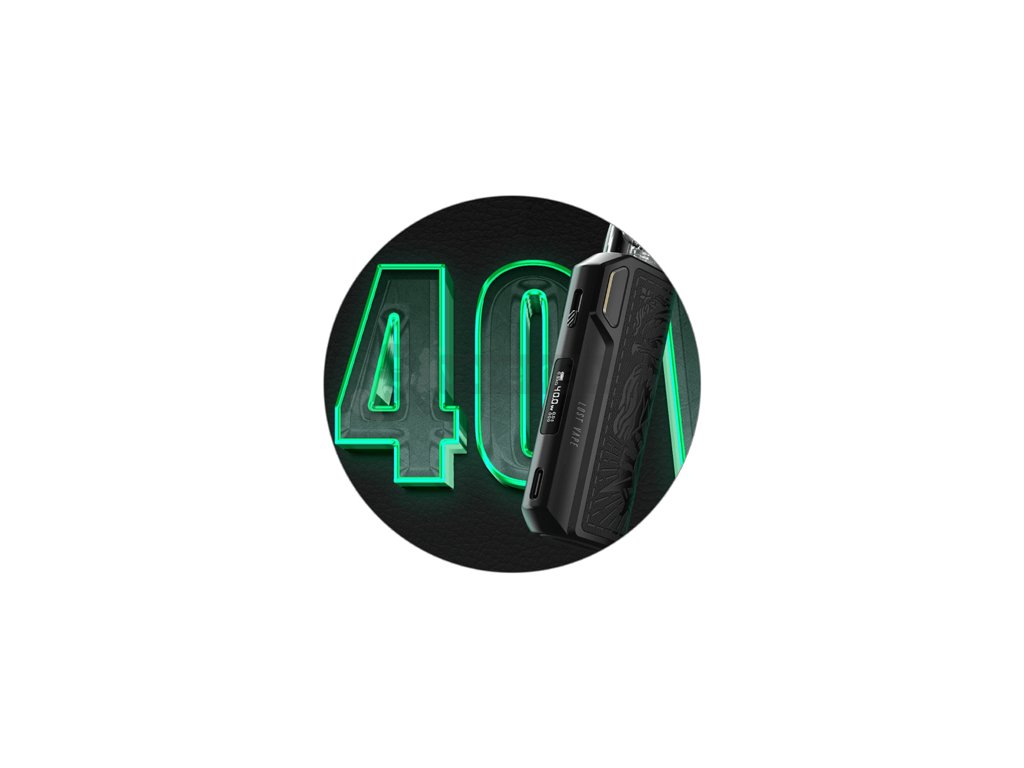 Lost Vape Thelema Elite 40 disponuje elektronickým čipem Quest 2.0, který podporuje ohromný výstupní výkon. Ten se zastavil až na úžasných 40 W. Výkon je plně regulovatelný a snadno si ho přizpůsobíte díky praktickému ovládacímu tlačítku a přehlednému displeji. Díky podpoře vysokého výkonu je e-cigareta vhodná pro všechny typy vaperů, osloví všechny od MTLkařů až po DLkaře.