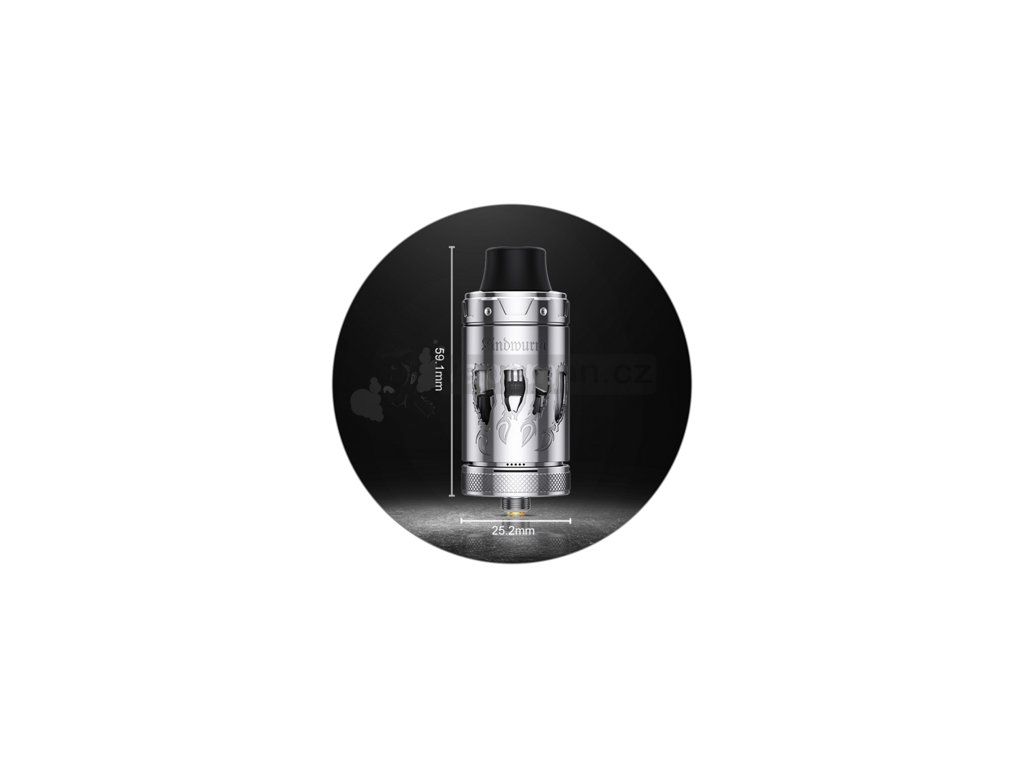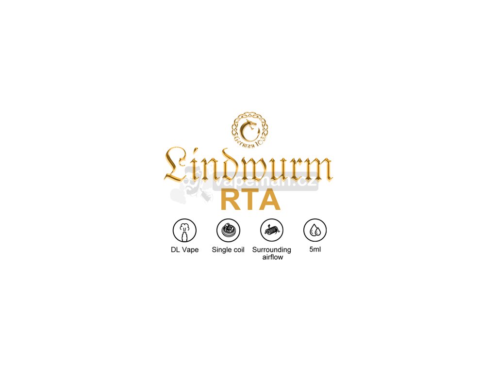 Clearomizér nabídne průměr 25,5 mm a délku jen 59,1 mm. Ve vrchní části je osazen náustkem s uchycením typu 810 a jeho spodní část zdobí závit typu 510 pro plnou kompatibilitu s většinou modů na dnešním trhu. Clearomizér Lindwurm RTA nabídne také obrovský objem tanku, ten pojme až 5 ml e-liquidu. Je navíc vybaven snadným a praktickým systémem doplňování, postačí pouze pootočit vrchním uzávěrem a můžete začít plnit. V jádru atomizéru se potom nachází základna pro jednu spirálku s precizně navrženou konstrukcí pro co nejjednodušší a nejrychlejší osazení. Celý atomizér nabuildujete už za několik málo minut. Spojení unikátního systému airflow a kvalitně zpracované konstrukce je zkrátka neodolatelné, s atomizérem se budete zaručeně vyjímat. K dostání je ve třech stylových a konvenčních barvách, z nichž si zaručeně vybere každý milovník DL potahu.