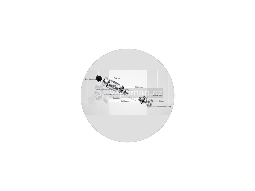 | Parametry produktu: Délka: 59,1 mm Průměr: 25,2 mm Objem: 5 ml Závit: 510 Plnění: vrchní Airflow: spodní + vzduchové vložky Základna: pro jednu spirálku Typ uchycení náustku: 810 Tento výrobek není určen pro náplně obsahující nikotin. |